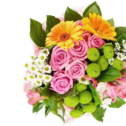 • Стандарт - роза - 3 шт., альстромерия - 5 шт., зелень, упаковка, лента