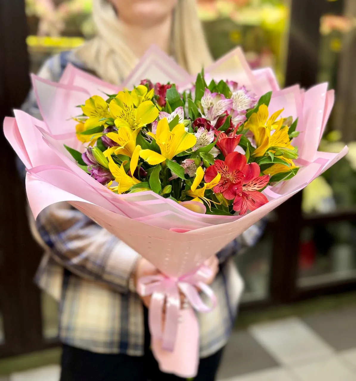 Букет из альстромерий, завернутый в нежно-розовую упаковку, — это истинное воплощение весеннего настроения и женственности. Каждая альстромерия, словно яркая искорка, излучает радость и тепло. Их разнообразие оттенков — от мягких пастельных до насыщенных ярких — создает гармоничное сочетание, которое способно украсить любой интерьер и поднять настроение.