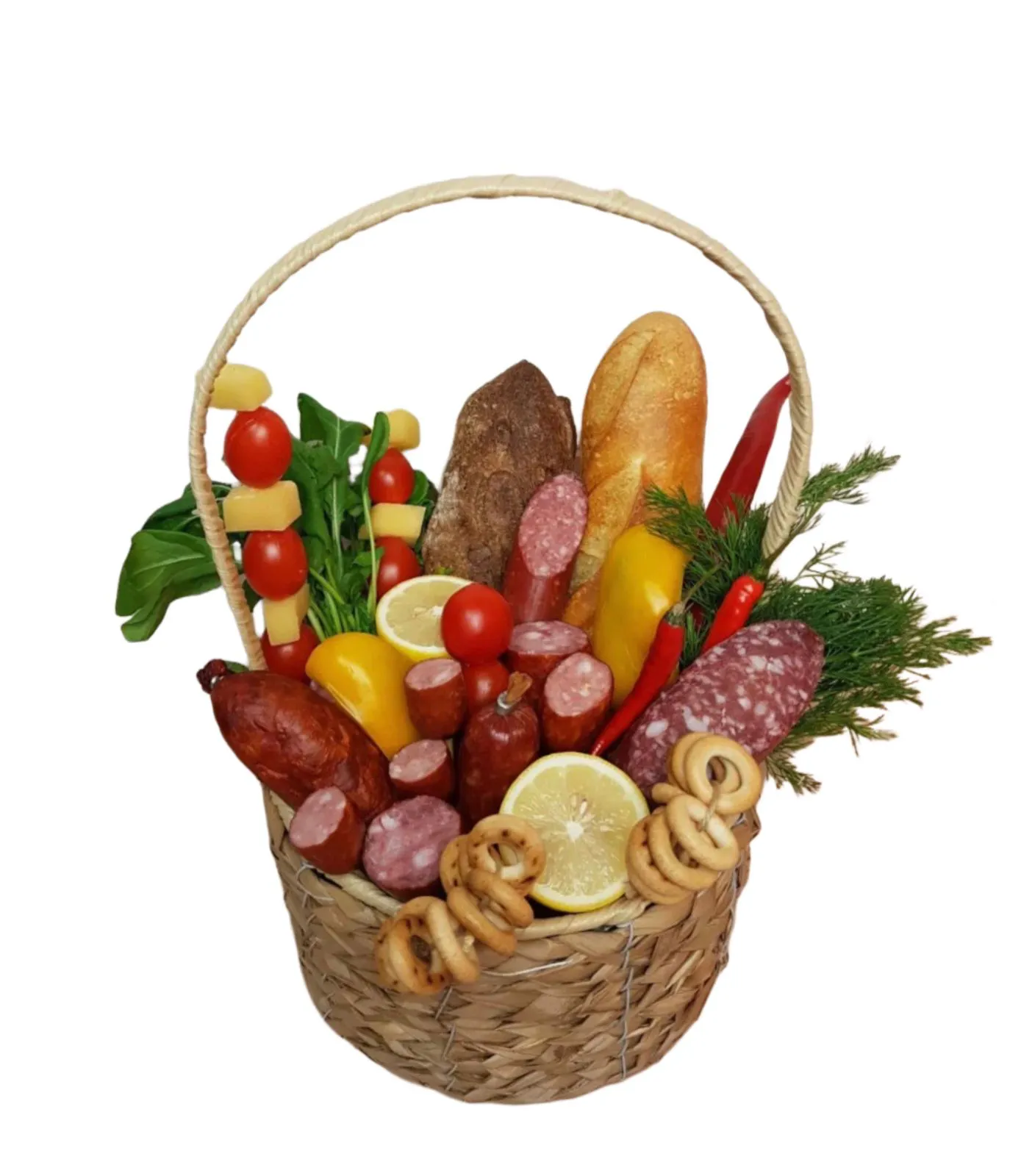 Состав: колбаса, хлебобулочные изделия, сыр, перец, томаты Черри, укроп, лимон, корзина.