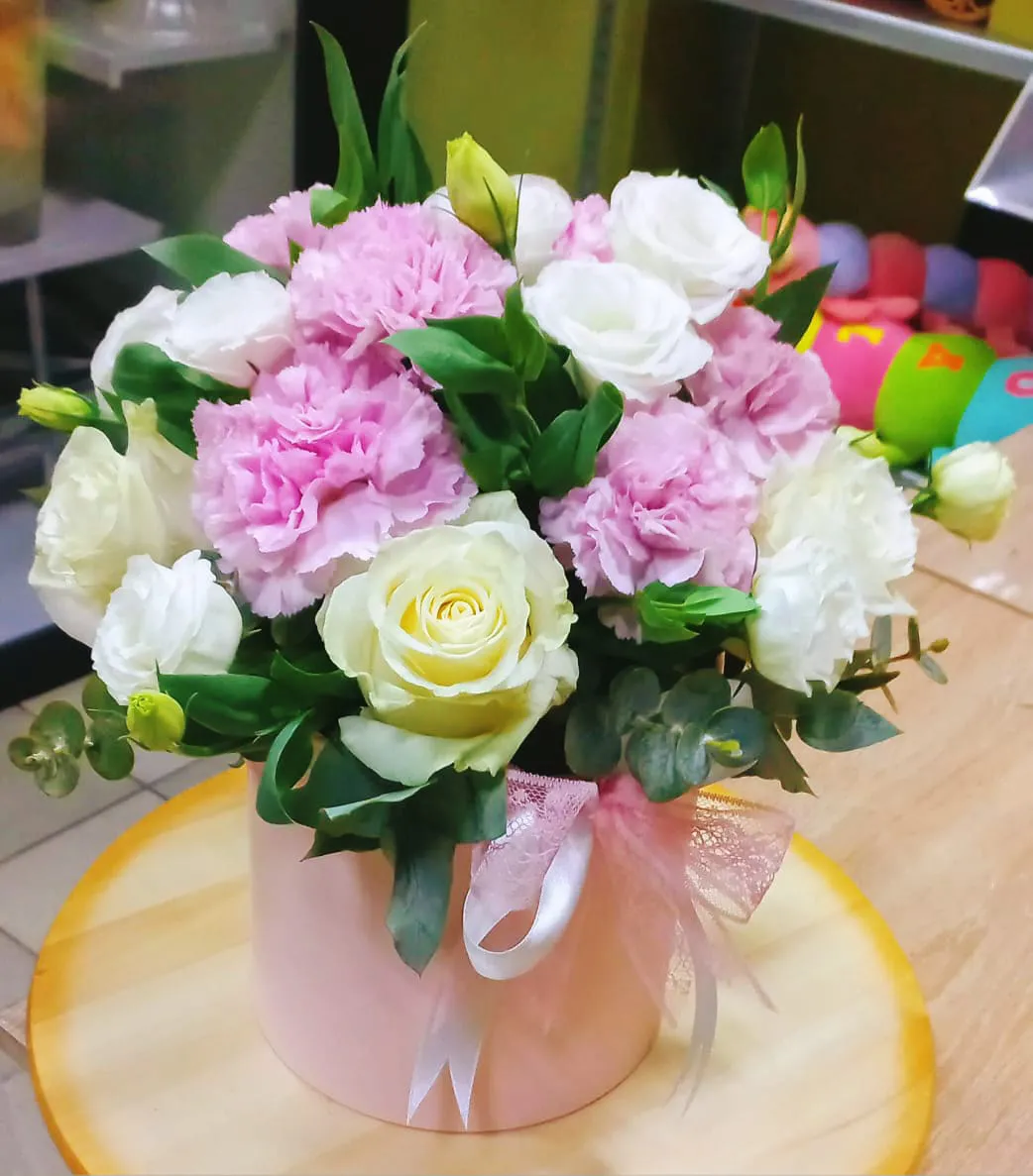 Роза, гвоздика, эустома ,зелень, оазис,шляпная коробка