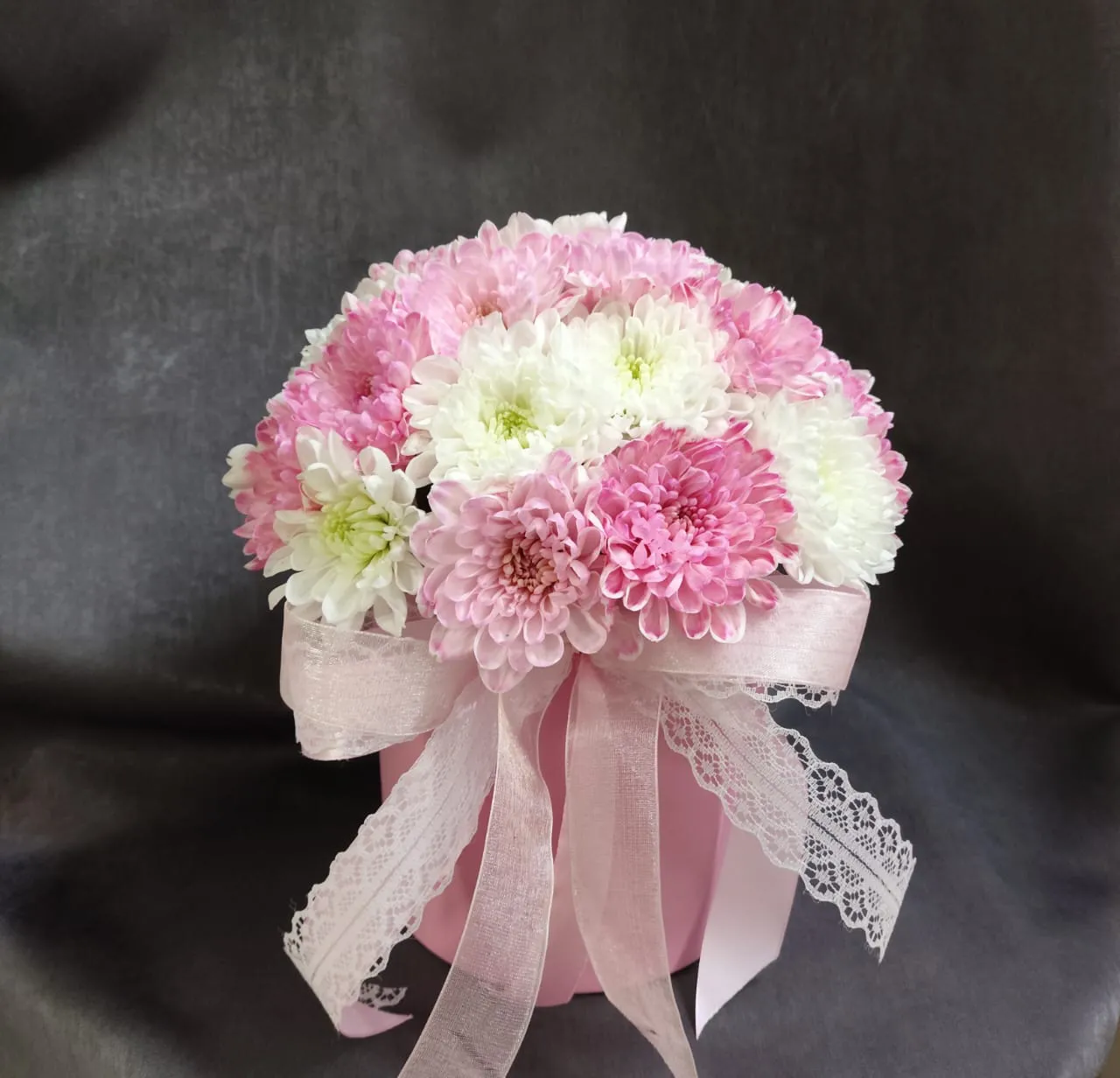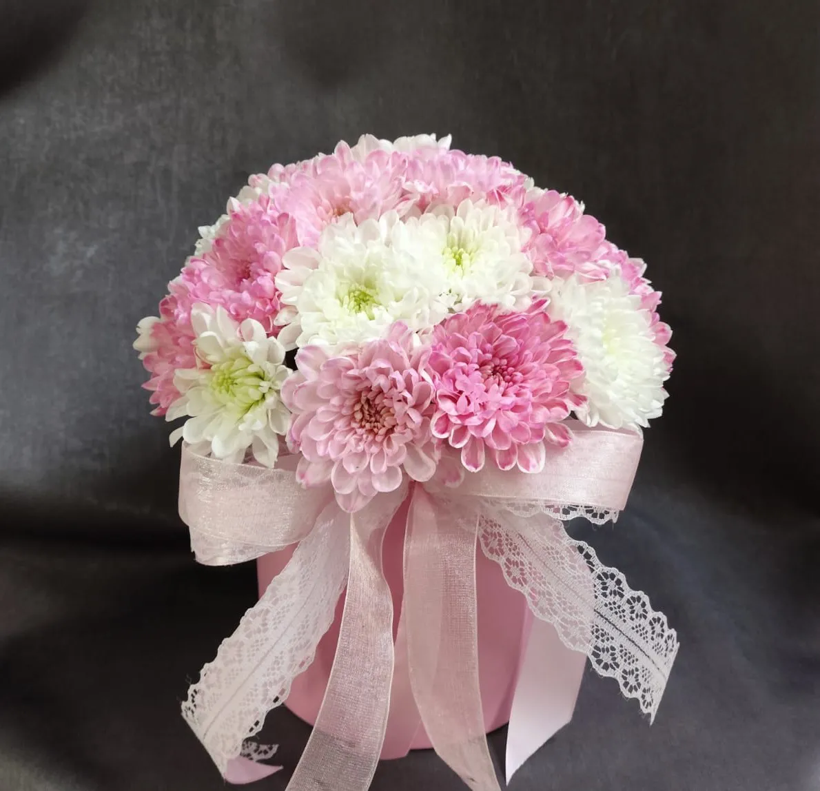 Кустовая хризантема в шляпной коробке — это настоящая симфония красоты и элегантности. Пышные соцветия нежного розового и чистого белого оттенков словно оживают в объятиях стильной коробки, насыщая атмосферу теплом и гармонией.