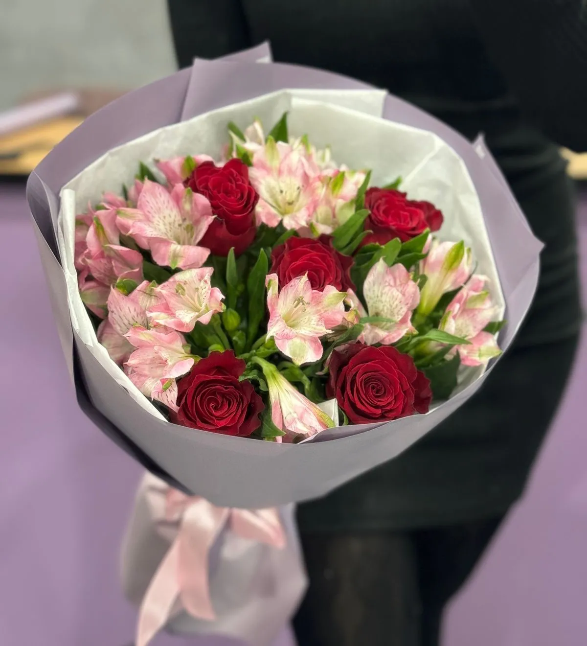Букет из красных роз и розовых альстромерий — это воплощение нежности и страсти. Яркие красные розы, символизирующие любовь и восхищение, излучают тепло и энергетику, привлекая взгляды своей яркостью и утонченностью. Их бархатистые лепестки радуют тактильные ощущения, словно зовут прикоснуться и насладиться красотой.