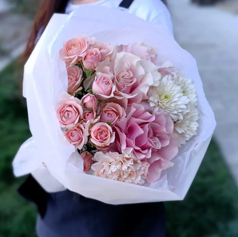 Французские розы, известные своими махровыми лепестками и пленительным ароматом, собраны в букет, чтобы подарить незабываемые эмоции. Нежные оттенки переплетаются, создавая гармоничную симфонию цвета, которая радует глаз и наполняет сердце теплом.