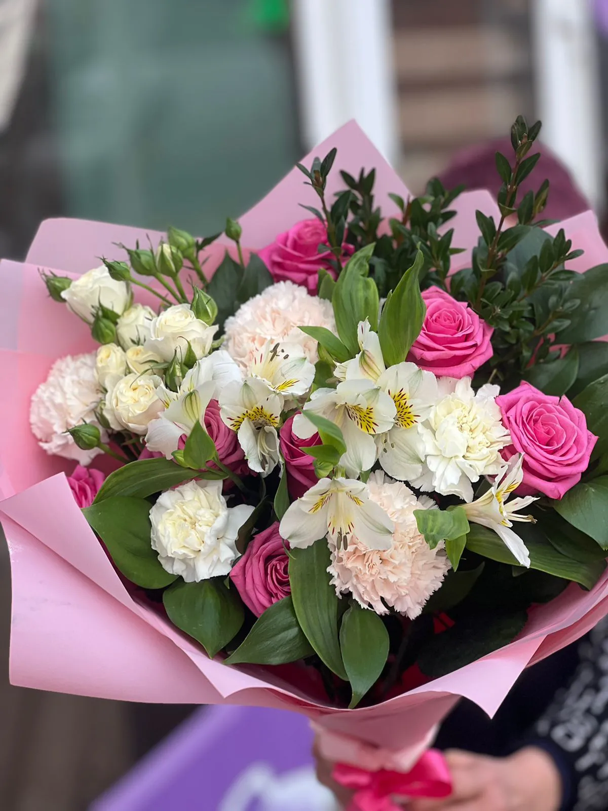 Роза, кустовая роза, гвоздика,альстромерия , зелень, упаковка, лента