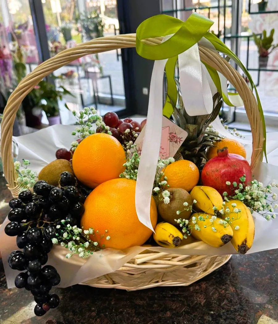Представьте себе корзину, наполненную разнообразными фруктами, олицетворяющими сочность и свежесть природы. Гранат ярко-красного и бананы золотистого цветов, переливающиеся на свету, соседствуют с красивыми спелыми киви, их нежная кожица зеленого и желтого оттенков ласкает глаз. Апельсины с гладкой кожурой, словно небольшие солнца, приглашают к себе, а гроздья винограда, скомпоновавшиеся в нежный ансамбль, выглядят как маленькие драгоценные камни.