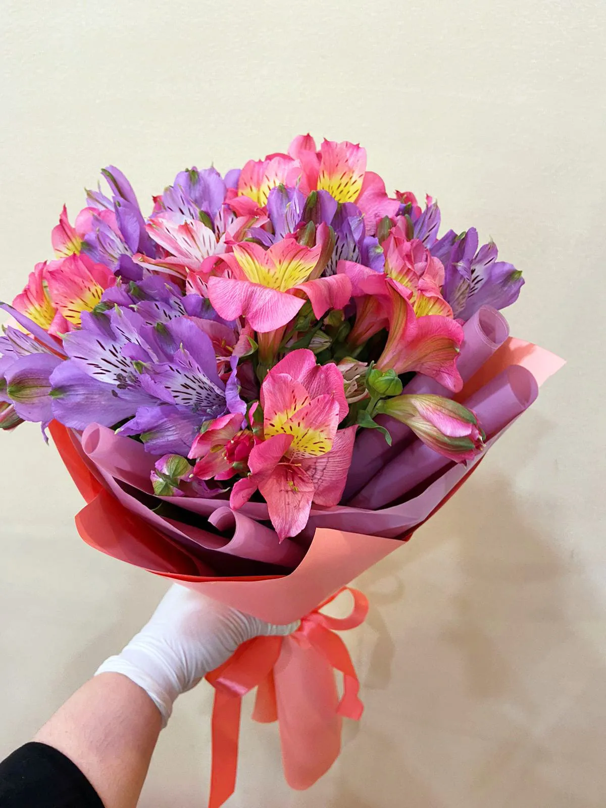 Состав букета: альстромерия микс, упаковка.лента